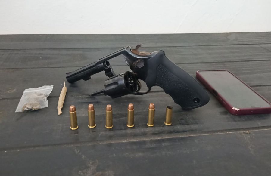 No rastro da fuga, o indivíduo deixou para trás uma pochete e um revólver calibre .38, que foi apreendido juntamente com cinco munições intactas e uma deflagrada. Também foram recolhidos um celular, uma bucha e uma porção de substância análoga à maconha.